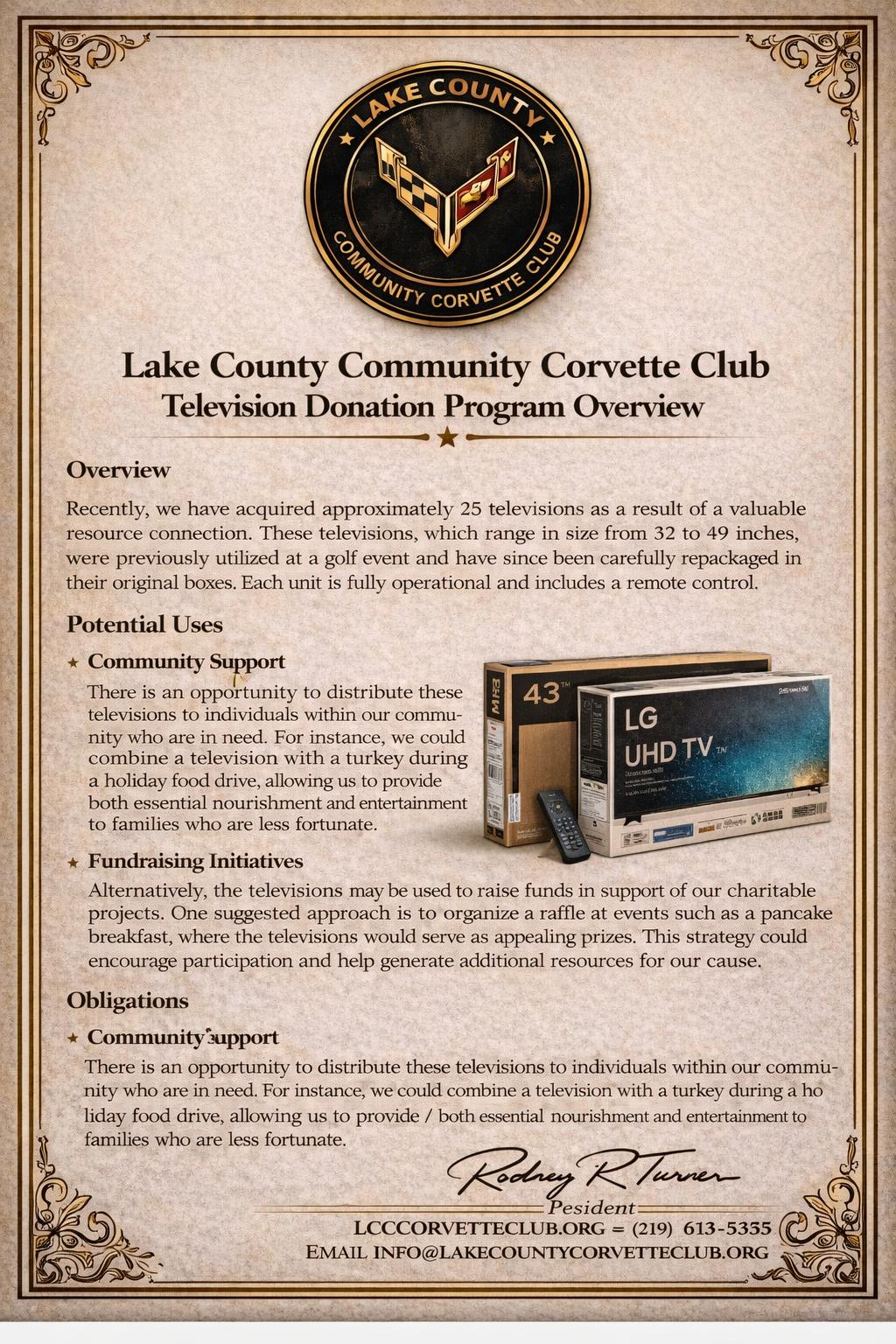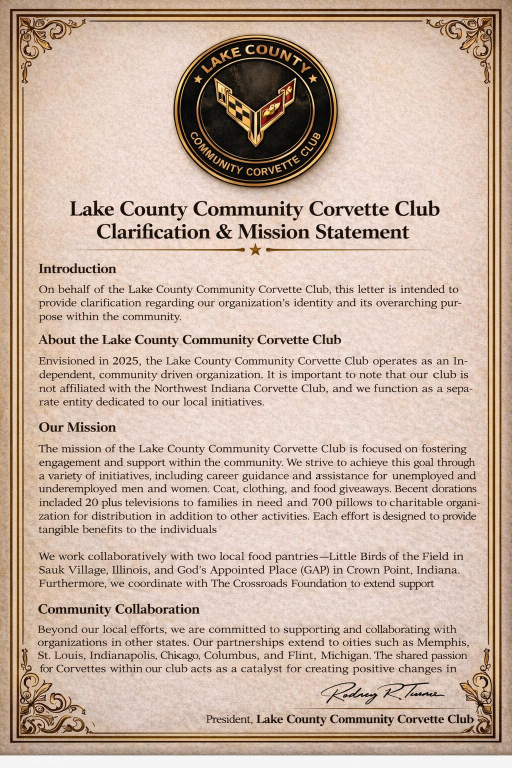 At the Lake County Community Corvette Club, we are committed to transparency and integrity in everything we do. All funds raised go directly toward charitable purposes and community initiatives.