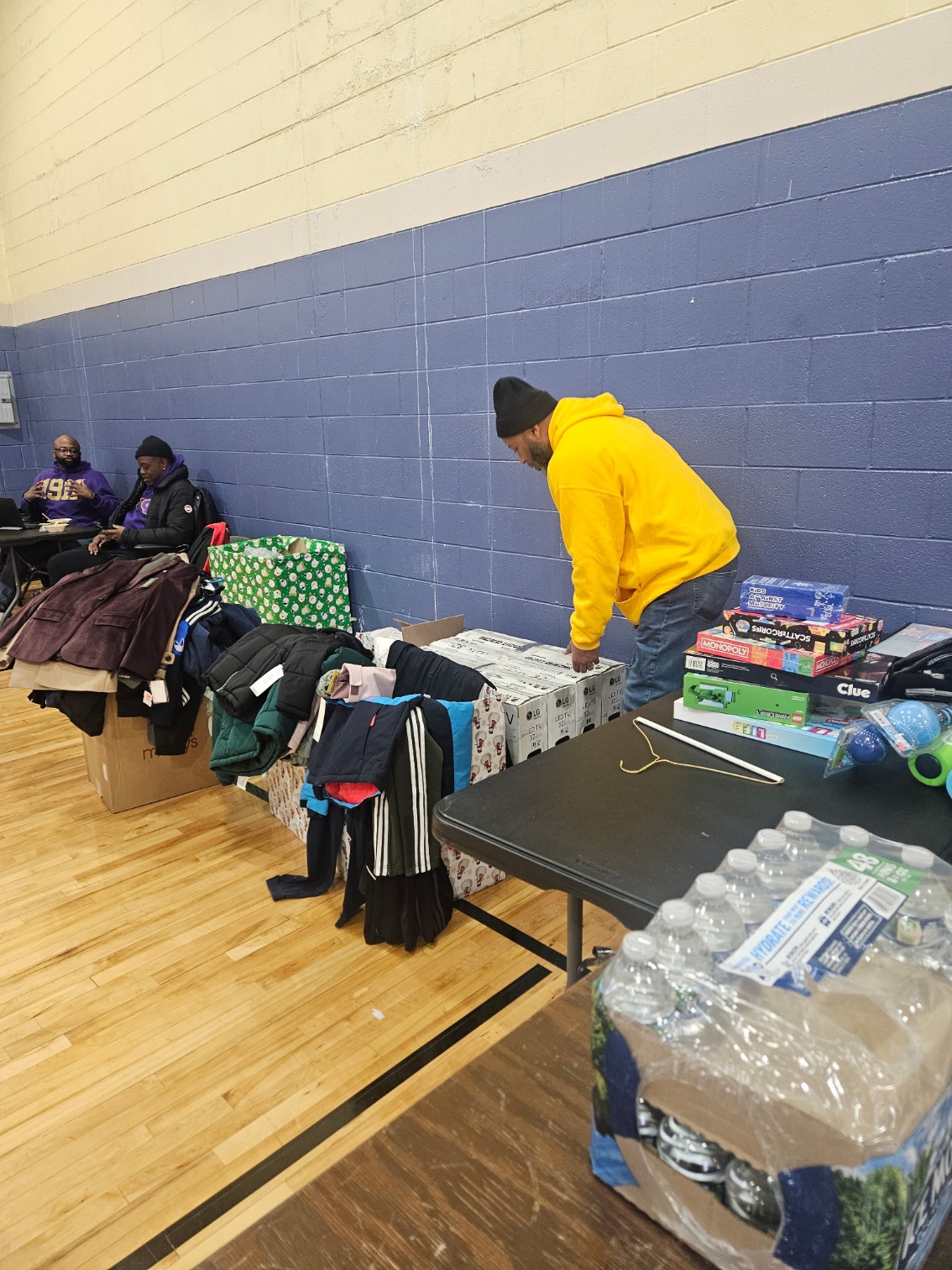 TV clothing give away in cooperation with Christmas give away Road Dogs foundation providing TVs clothing coats gloves hats and shoes for women and children’s shelters.